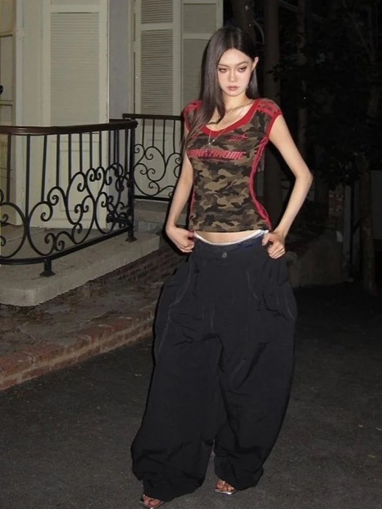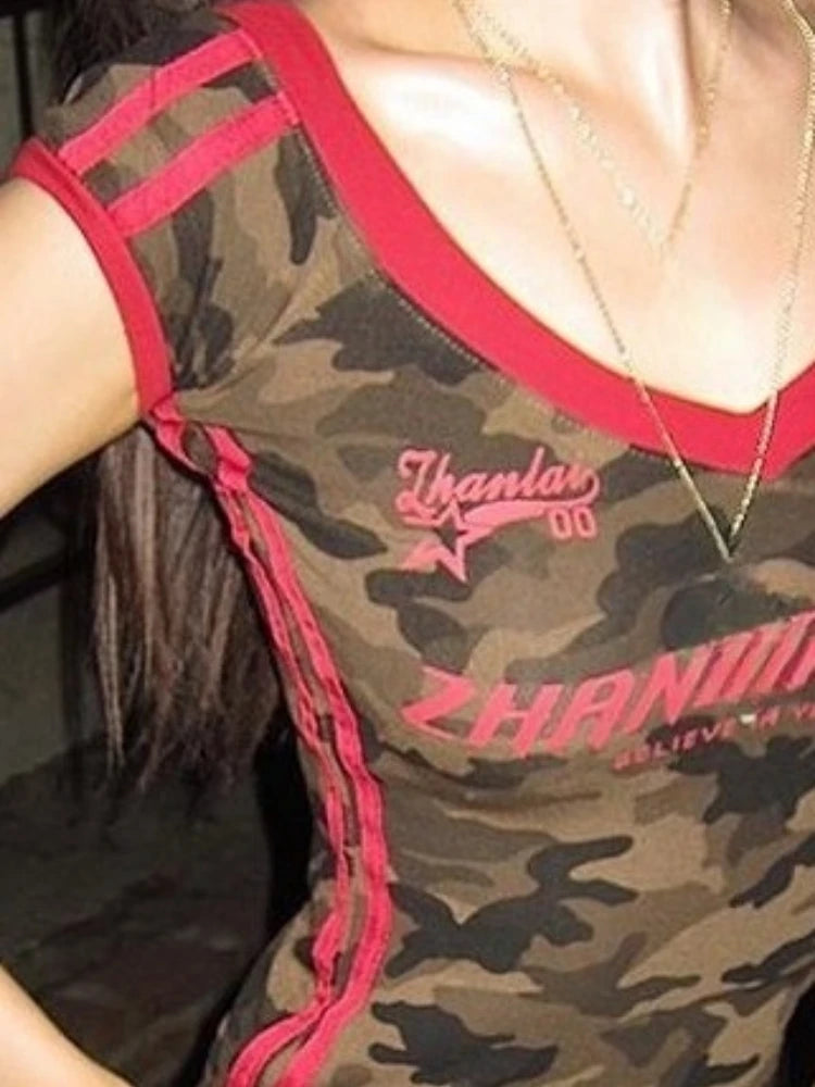 A tight camouflaged crop top with red stripes, which although are striking, portray the Y2K era