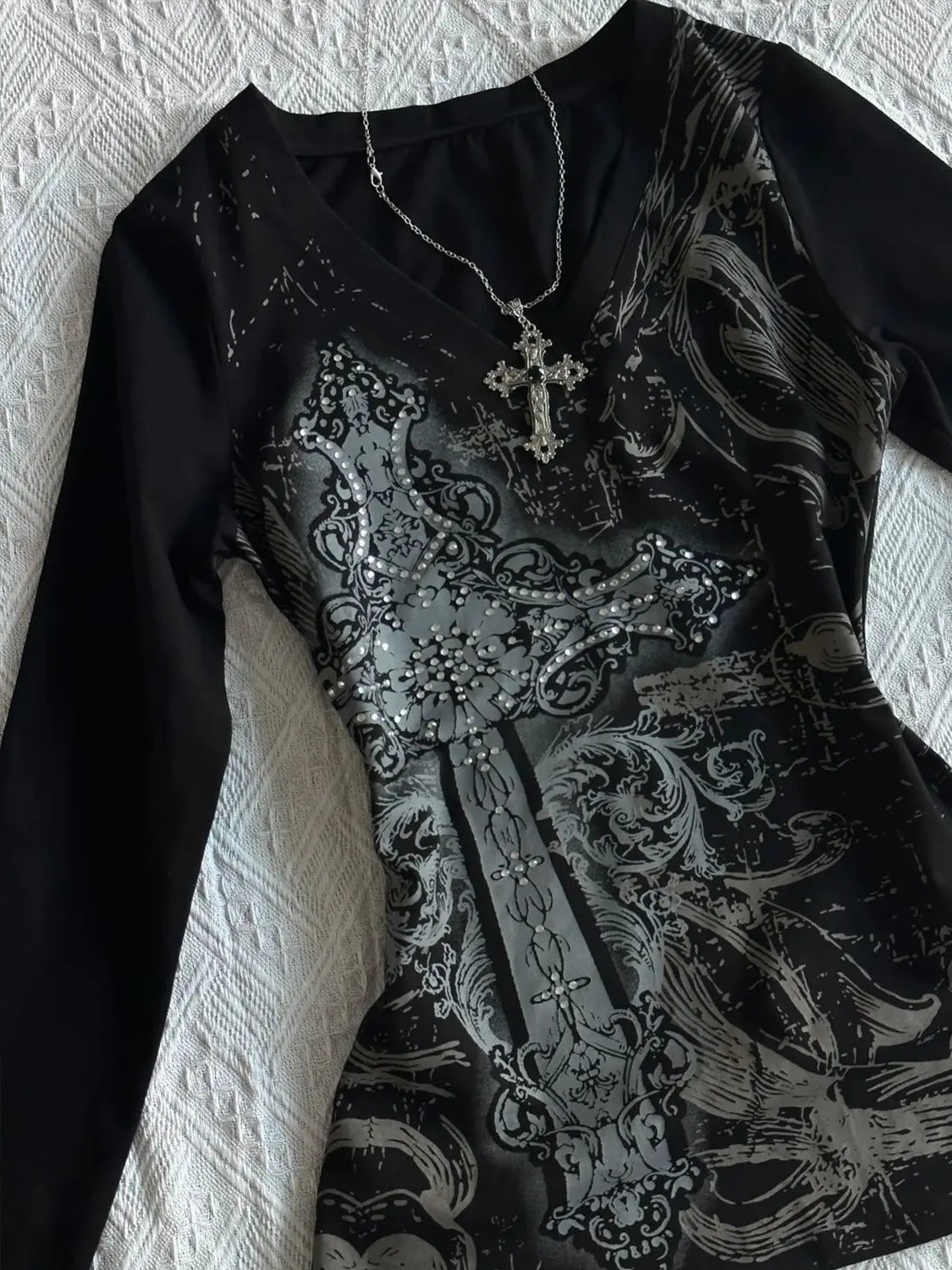 A black long sleeve top with grey designs on it. A must buy for all grunge addicts out there!